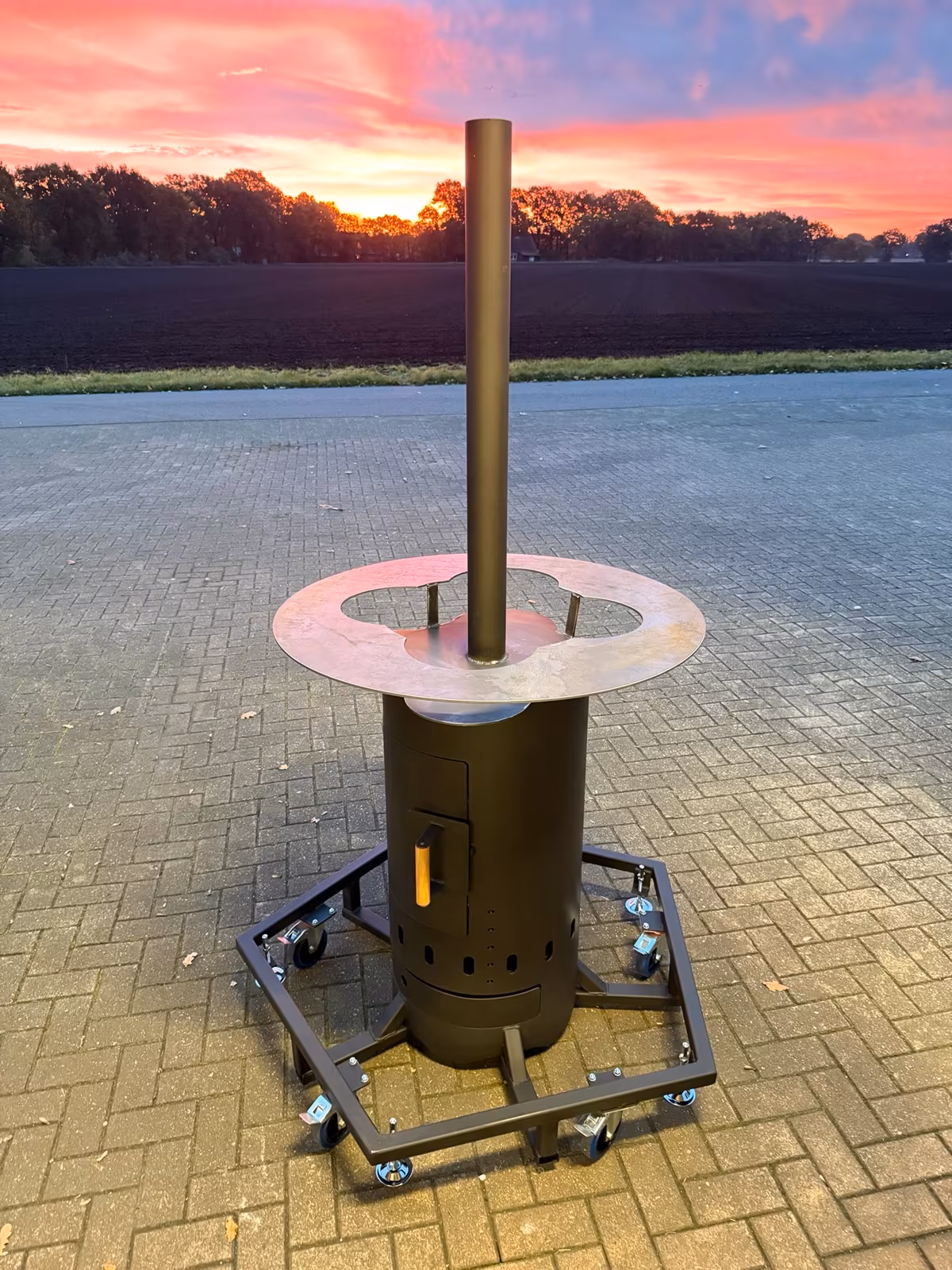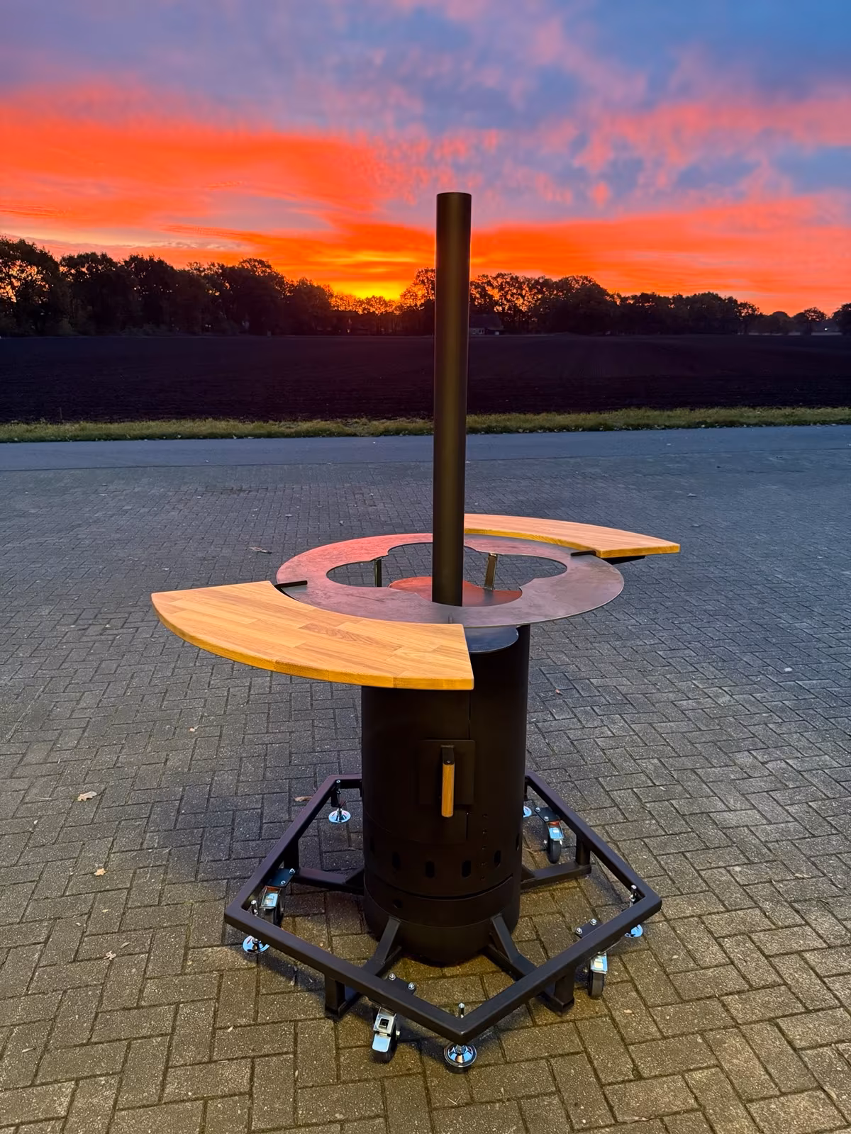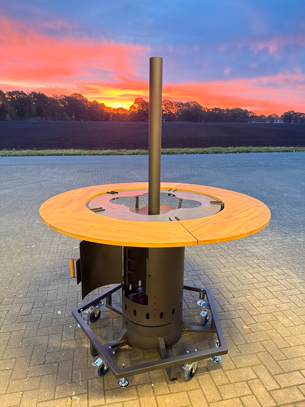 Das hier ist kein gewöhnlicher Stehtisch – sondern eine mobile Feuerstelle, die Wärme, Atmosphäre und Funktion in einem vereint.