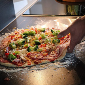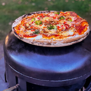 Den Pizzastein einfach mit anheizen. So wird beim reinschieben direkt die Feuchtigkeit vom Teig entzogen und der Boden wird schön kross. Das Feuer am besten in die Feuertonne am äußeren Rind verteilen, sodass die Wärme nicht direkt unter den Stein ist, da sonst der Teig zu viel Hitze bekommt und von oben nicht ausbackt.